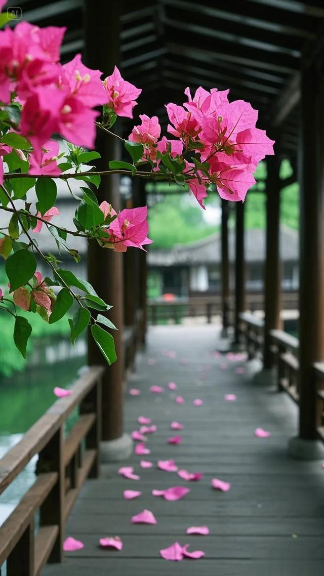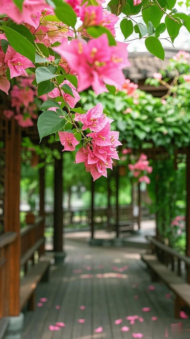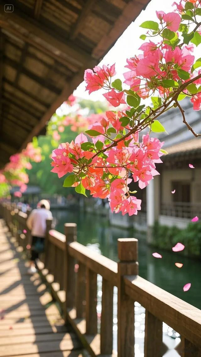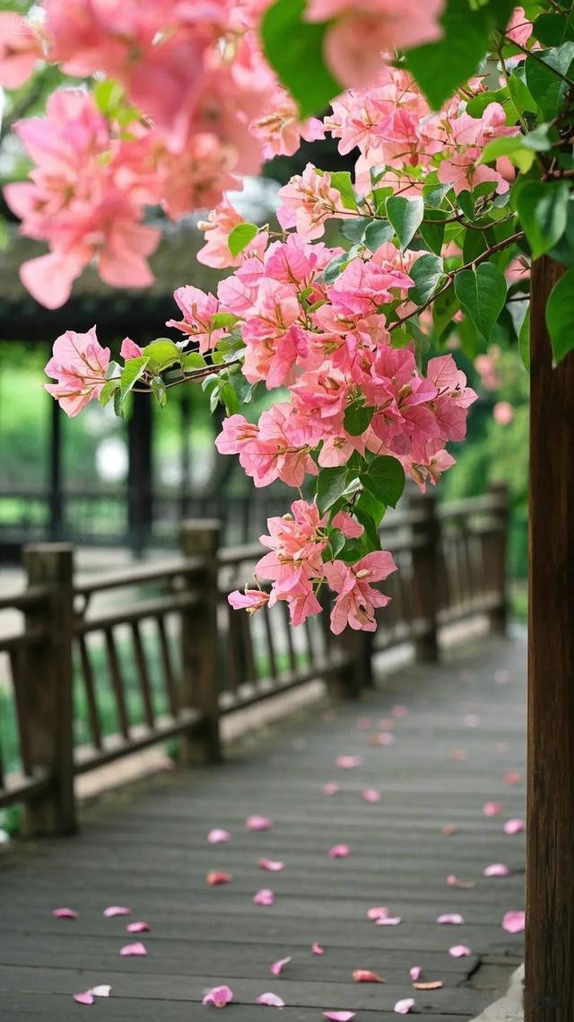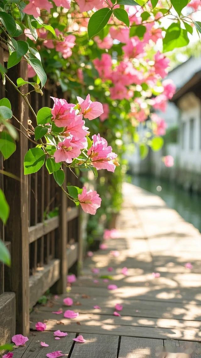 三角梅的花朵自树顶垂落,错落间尽显柔美之姿,翠绿叶片簇拥着粉嫩花瓣,将大自然的鬼斧神工展现得淋漓尽致。木栏杆与木板路质朴自然,在阳光轻抚下,木头表面泛出温润光泽,与周遭景致和谐相融。地面上,三角梅飘落的花瓣星星点点,似是大自然不经意间散落的诗行。背景中若隐若现的水道,更添几分灵韵。这幅画面,宛如世外桃源的一隅,让人沉浸于自然之美与建筑之魅交织的美好中,尽情感受放松身心、享受生活的惬意 。