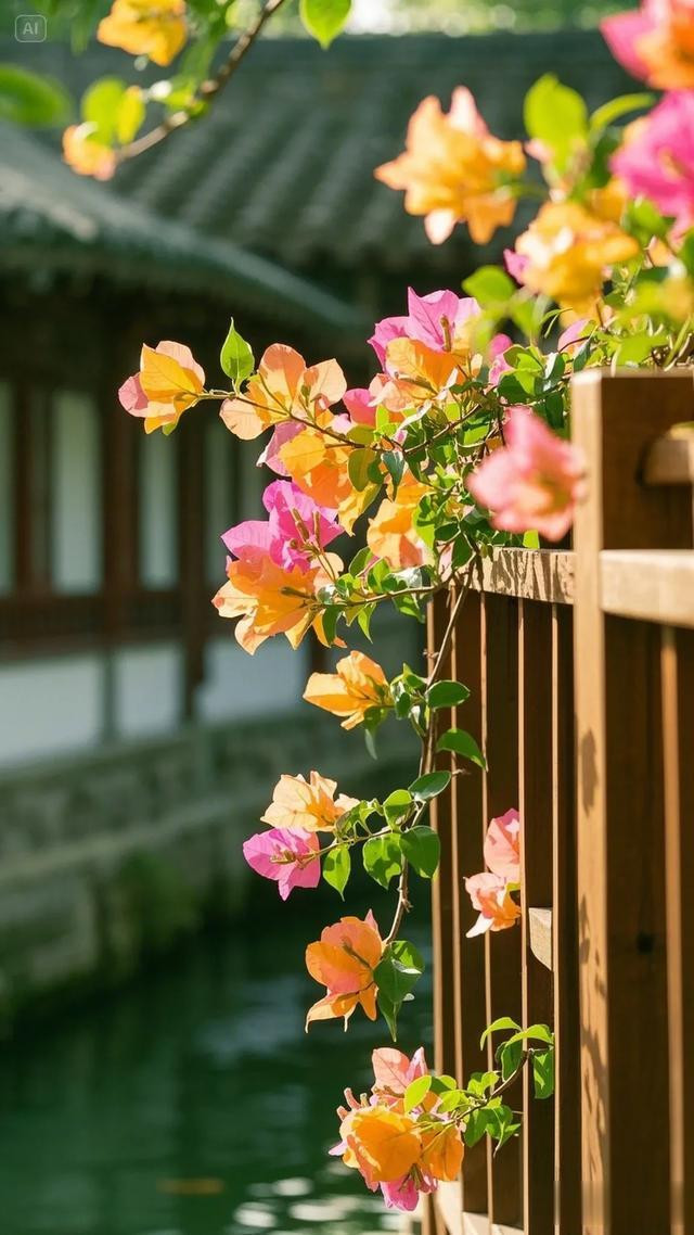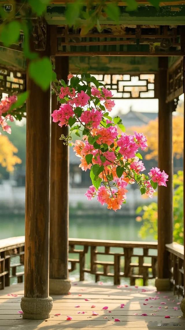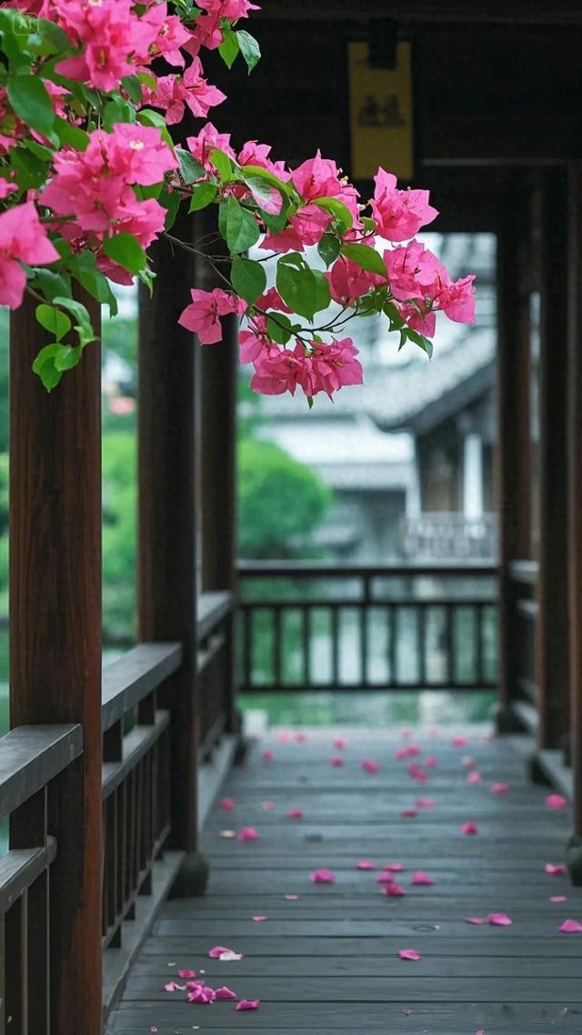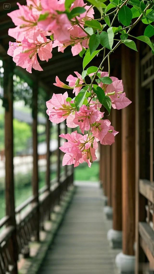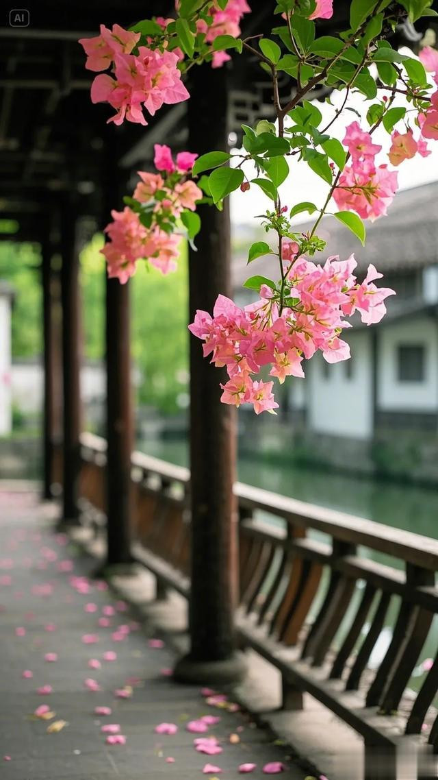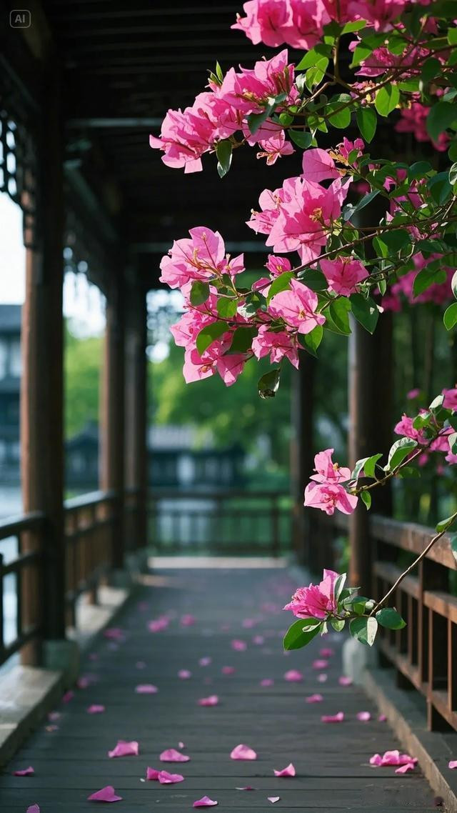 三角梅的花朵自树顶垂落,错落间尽显柔美之姿,翠绿叶片簇拥着粉嫩花瓣,将大自然的鬼斧神工展现得淋漓尽致。木栏杆与木板路质朴自然,在阳光轻抚下,木头表面泛出温润光泽,与周遭景致和谐相融。地面上,三角梅飘落的花瓣星星点点,似是大自然不经意间散落的诗行。背景中若隐若现的水道,更添几分灵韵。这幅画面,宛如世外桃源的一隅,让人沉浸于自然之美与建筑之魅交织的美好中,尽情感受放松身心、享受生活的惬意 。
