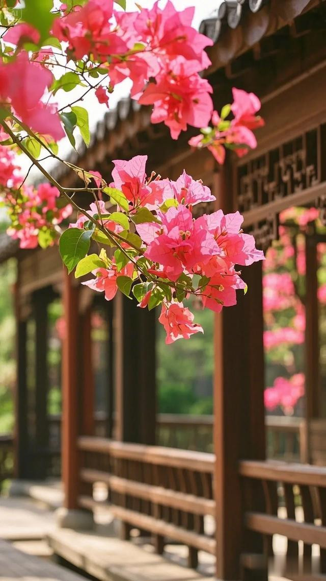 目光落于这张图片,一棵繁花满枝的粉色三角梅跃然眼前,瞬间为画面注入蓬勃生机。阳光慷慨倾洒,花朵与绿叶皆被笼罩在暖光之中,熠熠生辉。背景里传统中式建筑的轮廓,带着悠悠古韵,悄然晕染出宁静祥和的氛围,让人一眼便觉此处是个赏心悦目的所在。